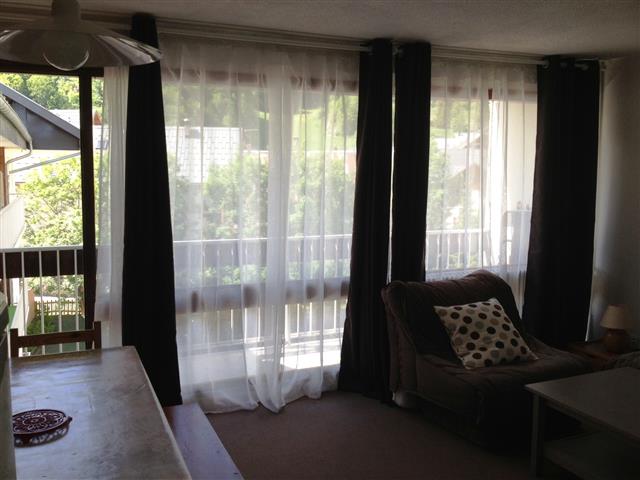 Appartement composée d'un double living, avec canapé et fauteuil canapé deux personnes personnes. Vue sur la Setaz